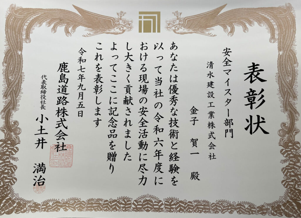 当社の現場監督が鹿島道路株式会社様より安全マイスター賞を受賞しました