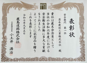 鹿島道路株式会社様より安全部門表彰(全国1位!!)をいただきました